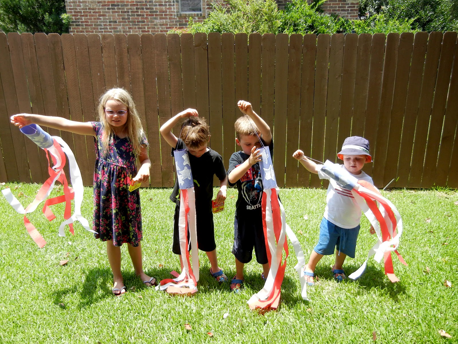 And for our art project, the kids stamped white stars on blue paper and Elizabeth cut out all of the steamers and we just stapled the whole thing together to make our patriotic windsocks.