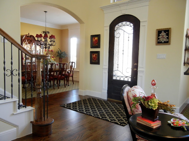 We had our floors done last summer and I am still recovering. Here you can get a glimpse of the new color. This was hardwood before and we just had this area sanded down and restained a little darker.